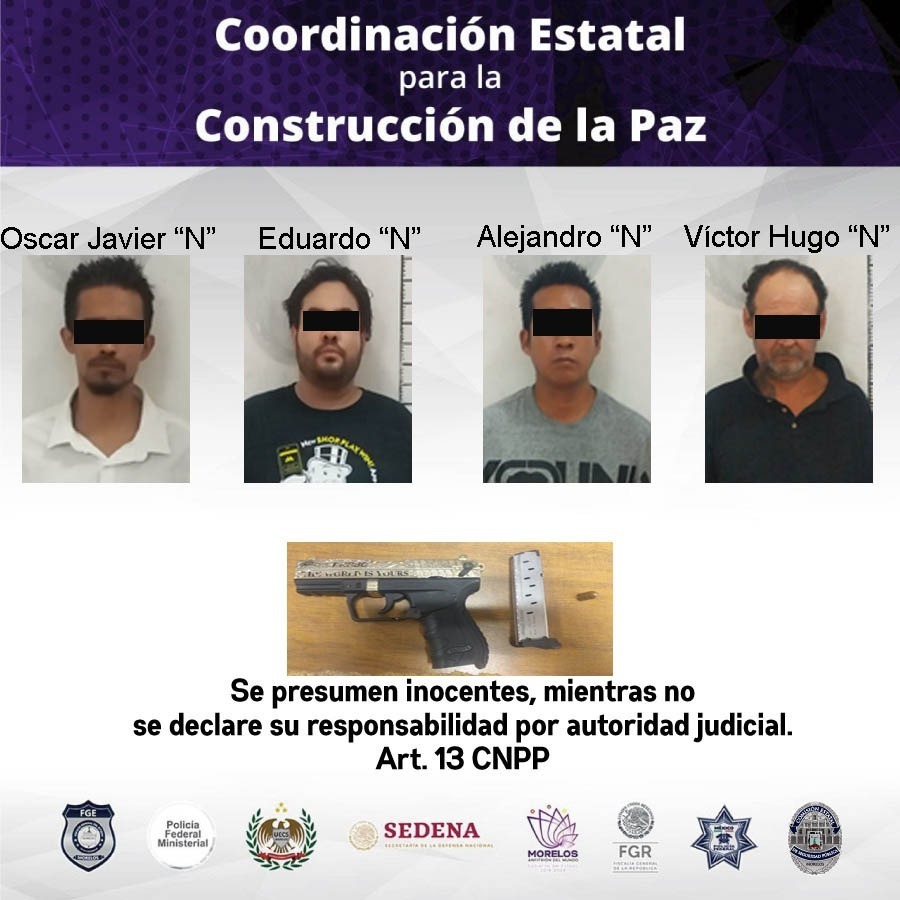 La noche de este domingo, elementos del Mando Coordinado Policía Morelos detuvieron a cuatro hombres por su presunta responsabilidad en el delito de violación a la Ley Federal de Armas de Fuego y Explosivos, en el municipio de Yautepec.