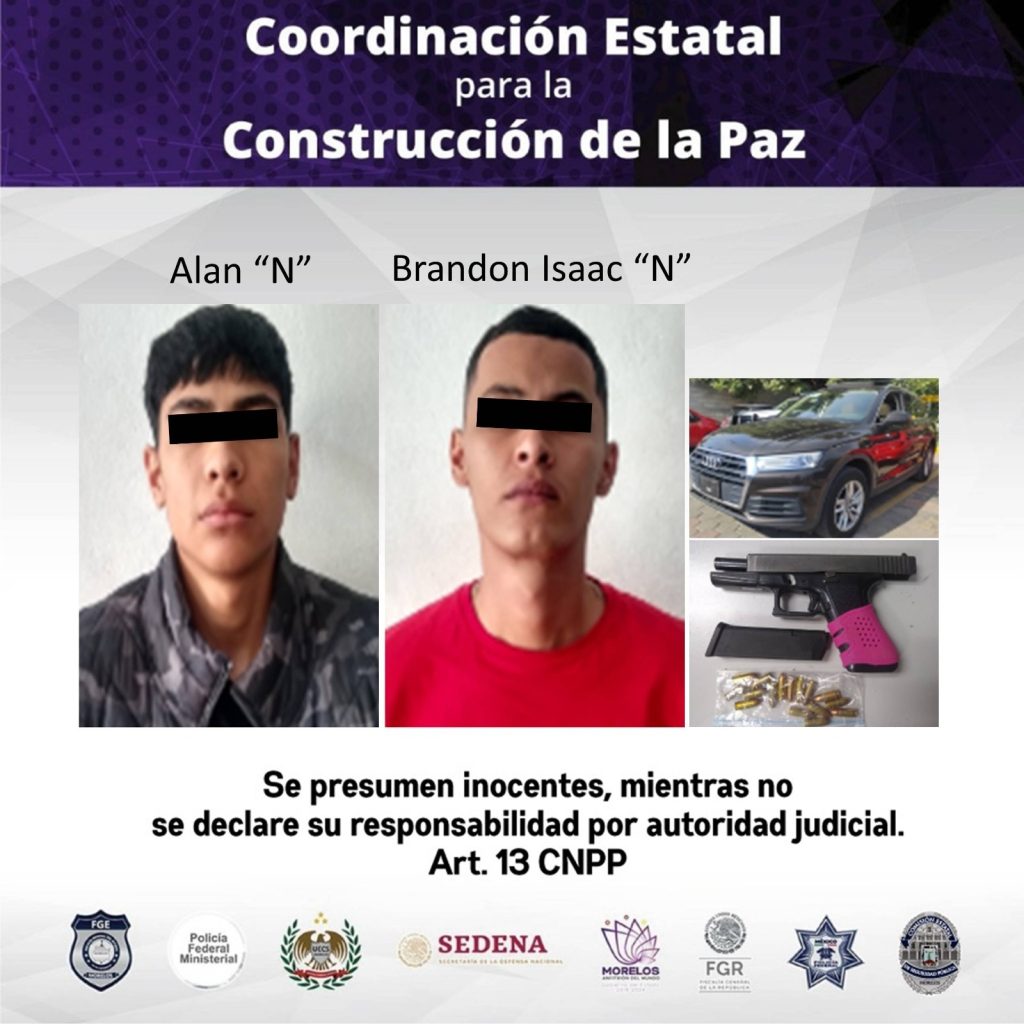 Elementos que integran la Estrategia de Seguridad Mando Coordinado Policía Morelos detuvieron a dos hombres por su presunta responsabilidad en el delito violación a la Ley Federal de Armas de Fuego y Explosivos, posesión de vehículo de procedencia ilícita y/o lo que resulte, en el municipio de Jiutepec.