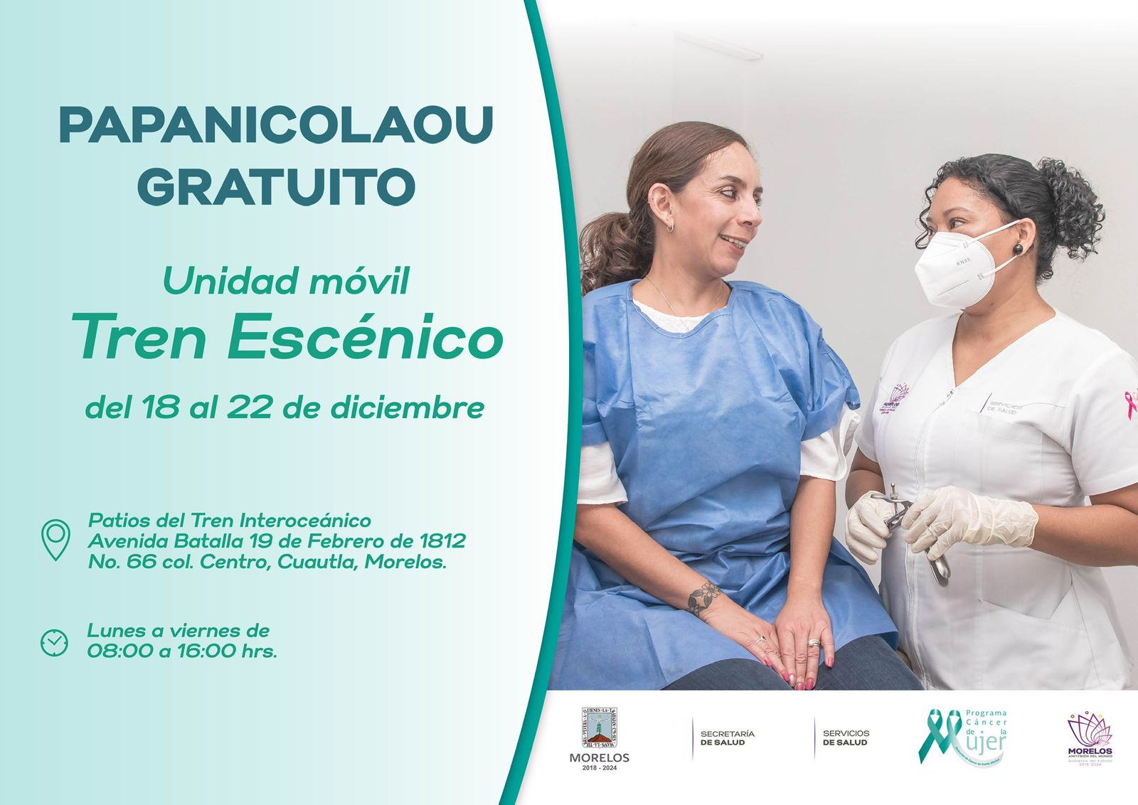 “En Cuautla se colocarán unidades móviles de mastografías y citologías en el Tren Escénico, ubicado en los Patios del Tren Interoceánico, en avenida Batalla 19 de Febrero de 1812 de la colonia Centro, y sólo el sábado 23 de diciembre se mantendrán mastografías”, dijo.