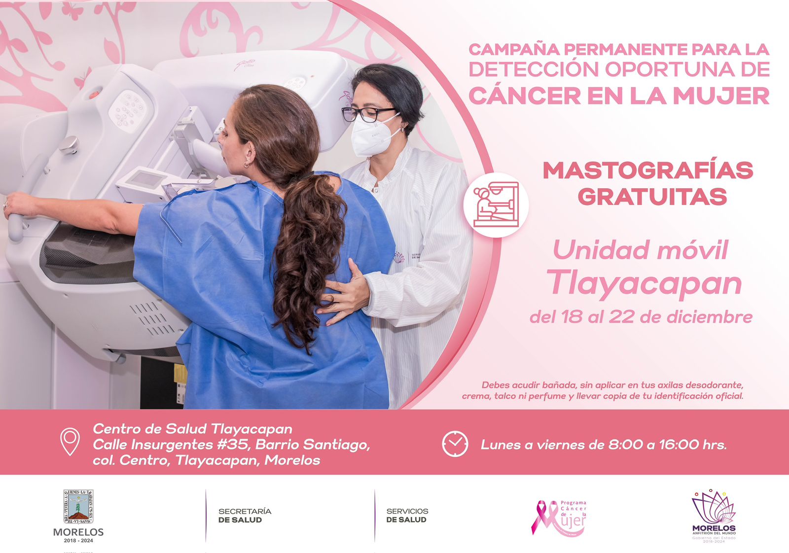 Servicios de Salud de Morelos (SSM) informó que, del 18 al 29 diciembre, estarán disponibles unidades móviles de mastografías y citologías en los municipios de Tepoztlán, Tlayacapan y Cuautla, para detectar a tiempo el cáncer de mama.