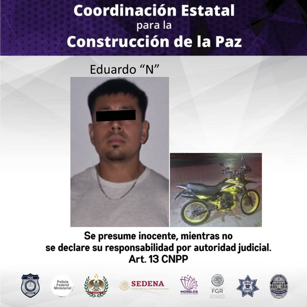 Elementos que integran la Estrategia de Seguridad Mando Coordinado Policía Morelos detuvieron a un hombre por su presunta responsabilidad en el delito de posesión de una motocicleta de procedencia ilícita y/o lo que resulte, en el municipio de Tlaltizapán.