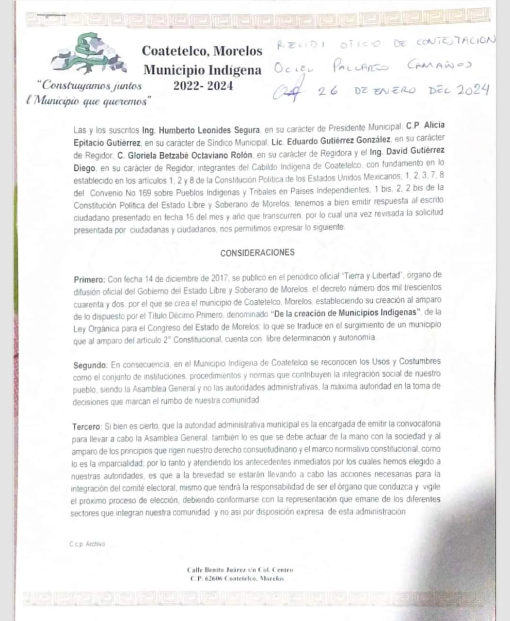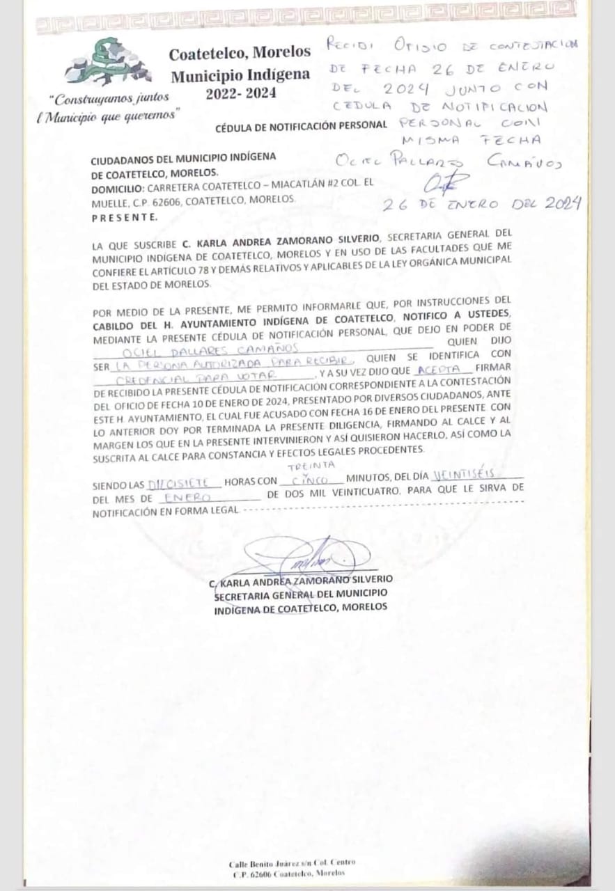 El oficio que estuvo firmado por los integrantes del cabildo, cita el decreto por el que se aprobó la municipalización de Coatetelco, al recordar que la autoridad administrativa municipal es la encargada de emitir la convocatoria para llevar a cabo la Asamblea General.