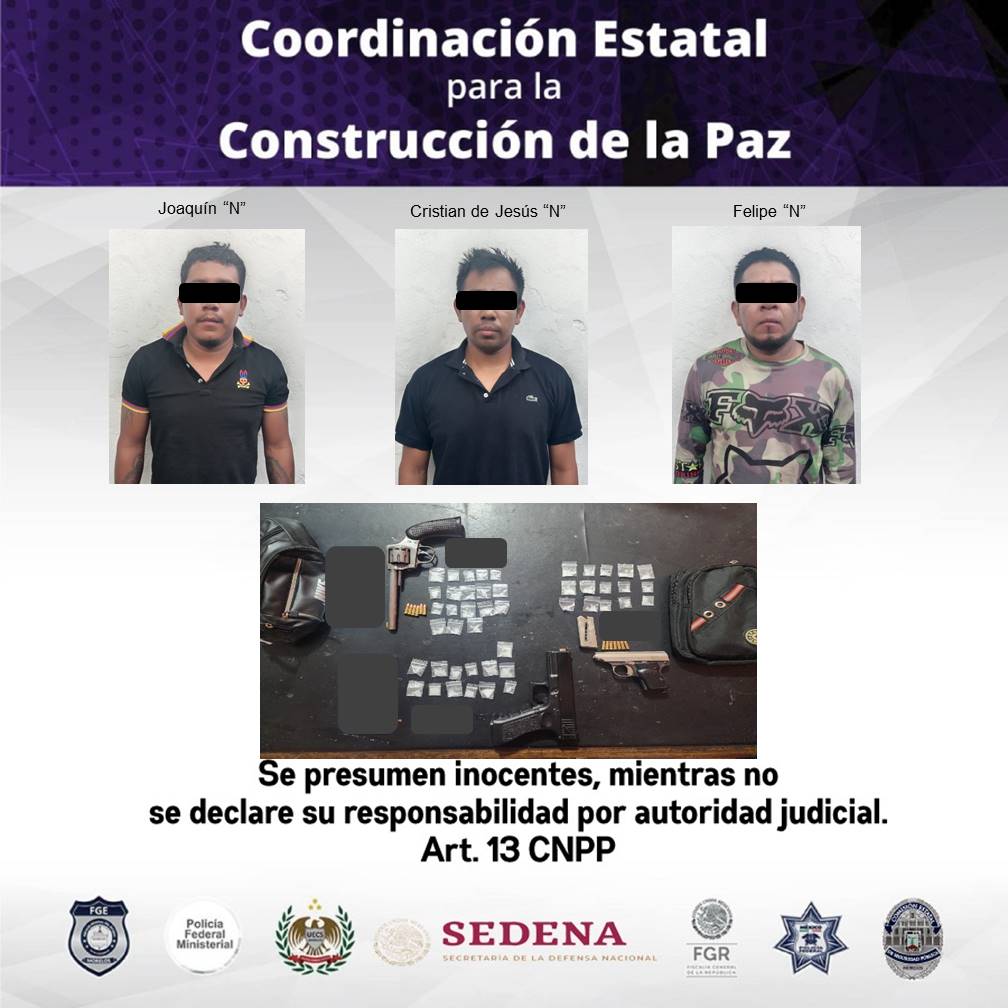 Por lo anterior, detuvieron a Joaquín “N”, de 25 años; Cristian de Jesús “N”, de 30 años; y Felipe “N”, de 33 años de edad; quienes después de indicarles sus derechos de ley, fueron puestos a disposición del agente del Ministerio Público para que determine su situación jurídica.