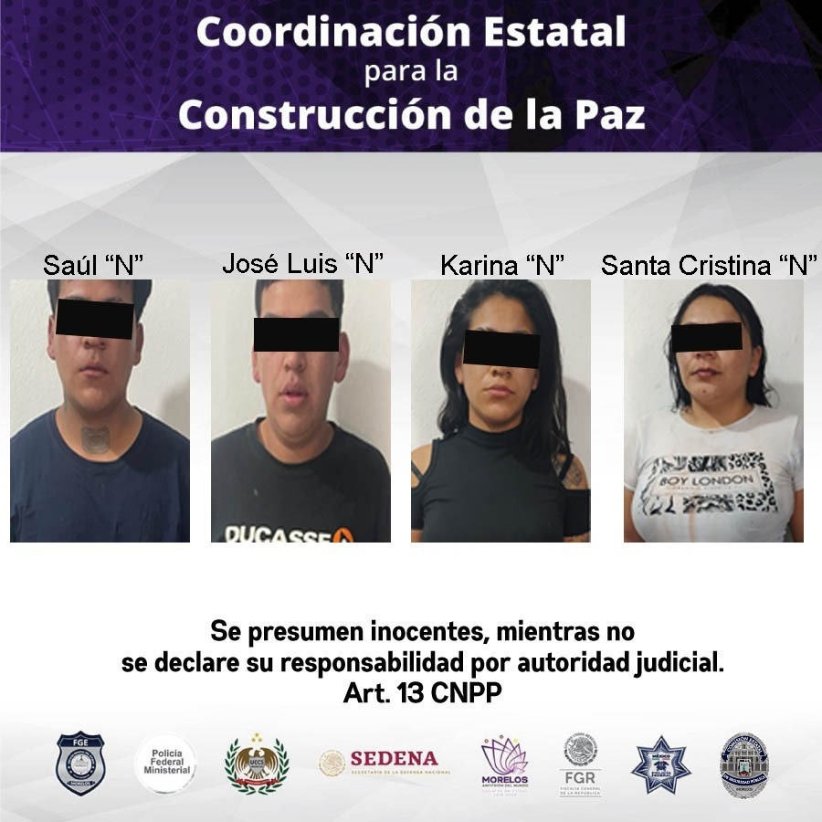 Mediante el señalamiento directo de las víctimas, los elementos de la Policía Morelos detuvieron a Saúl “N”, de 21 años; José Luis “N”, de 18 años; Karina “N”, de 24 años y Santa Cristina “N”, de 30 años de edad, quienes después de indicarles sus derechos de ley, fueron puestos a disposición de la autoridad competente.