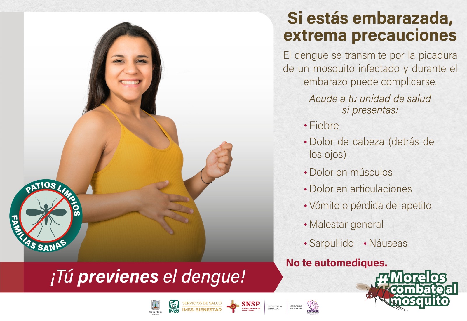 Servicios de Salud de Morelos (SSM) advirtió a mujeres embarazadas la importancia de extremar cuidados personales para prevenir dengue, zika y chikungunya, toda vez que pueden poner en riesgo su vida y la del bebé.