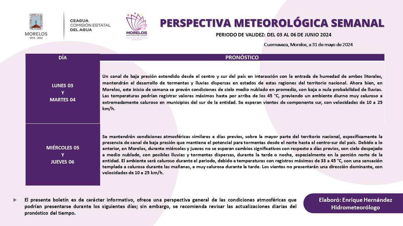 Debido a lo anterior, en Morelos, durante miércoles y jueves no se esperan cambios significativos con respecto a días previos, con cielo despejado a medio nublado, con posibles lluvias y tormentas dispersas, durante la tarde o noche, especialmente en la porción norte de la entidad. El ambiente será caluroso durante el periodo, debido a temperaturas con registros máximos de 33 a 45 °C, con una sensación templada a calurosa durante las mañanas, a muy calurosa durante la tarde. Los vientos no presentarán una dirección dominante, con velocidades de 10 a 25 km/h.