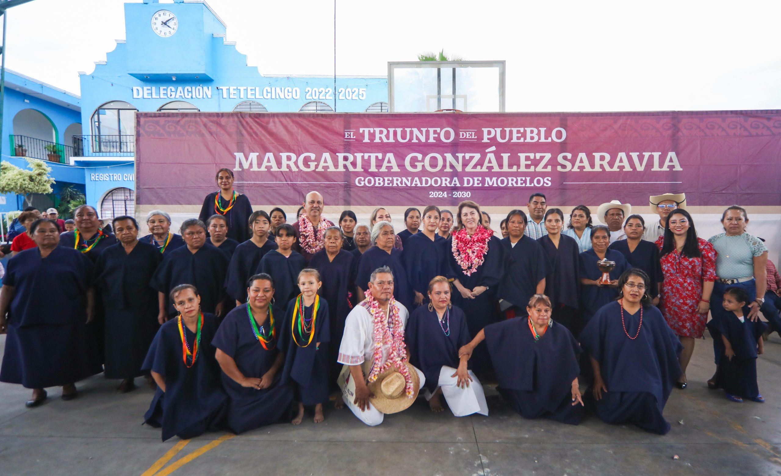 En la gira del agradecimiento de la gobernadora electa de Morelos, Margarita González Saravia, fue recibida por pobladores y autoridades indígenas de la comunidad de Tetelcingo, quienes la reconocieron como una tetelcinga honorífica, vistiéndola con el tradicional Chincuete.