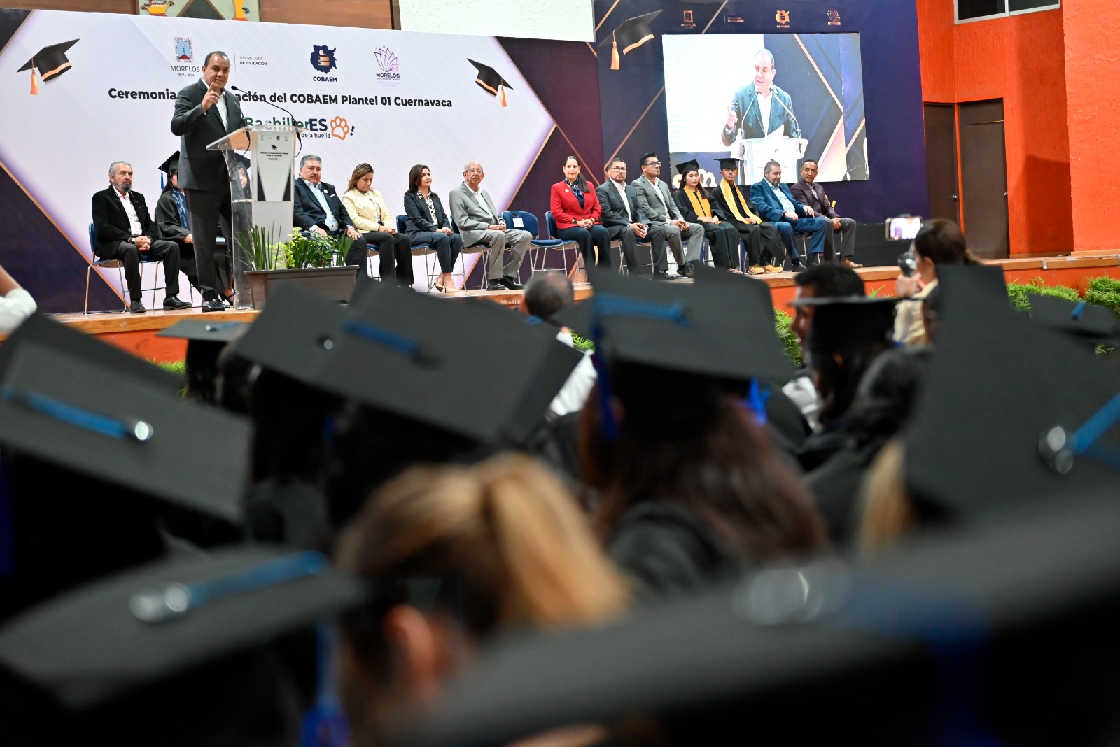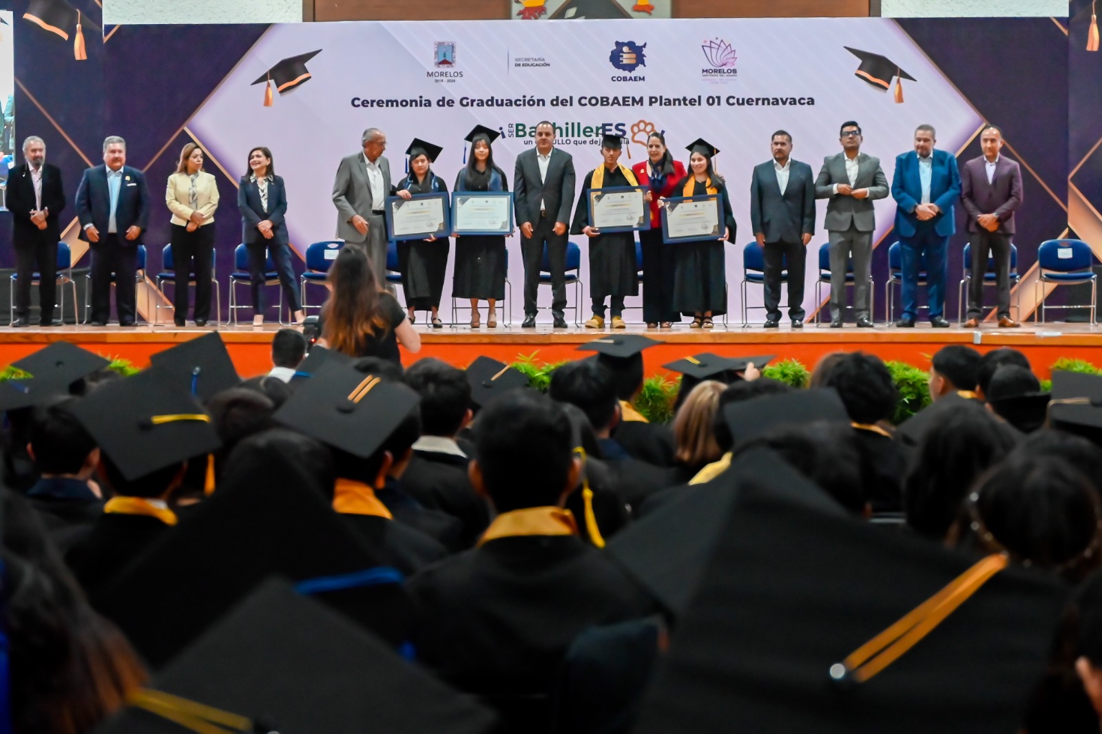 La celebración se llevó a cabo en el Gimnasio Auditorio de la Universidad Autónoma del Estado de Morelos (UAEM), donde el mandatario estatal otorgó reconocimientos a quienes obtuvieron los mejores promedios de la Generación 2021-2024.