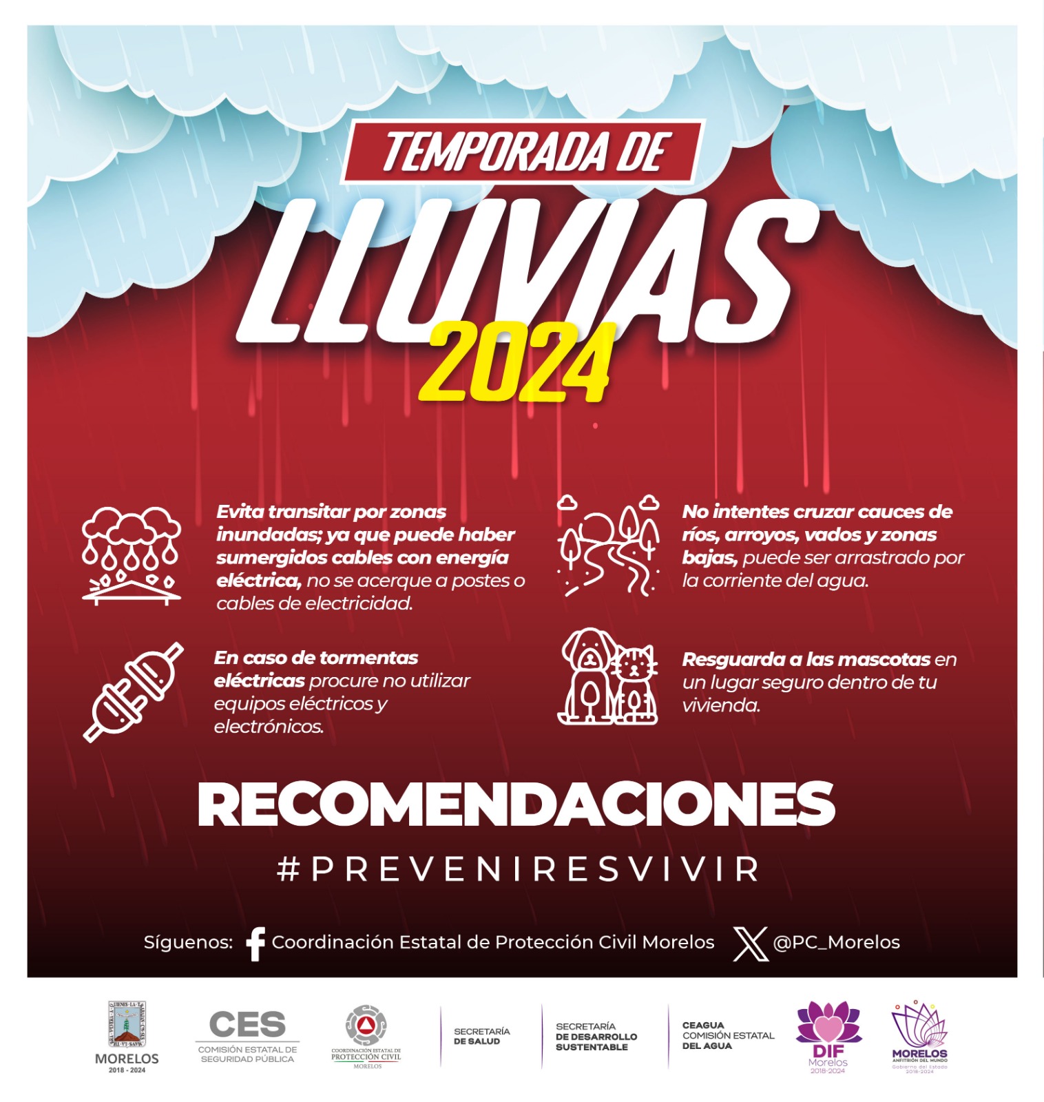 El Gobierno del estado de Morelos emite recomendaciones a la población ante la temporada de lluvias, ya que de acuerdo a los pronósticos del tiempo se esperan tormentas y precipitaciones fuertes en gran parte del territorio para las siguientes horas.