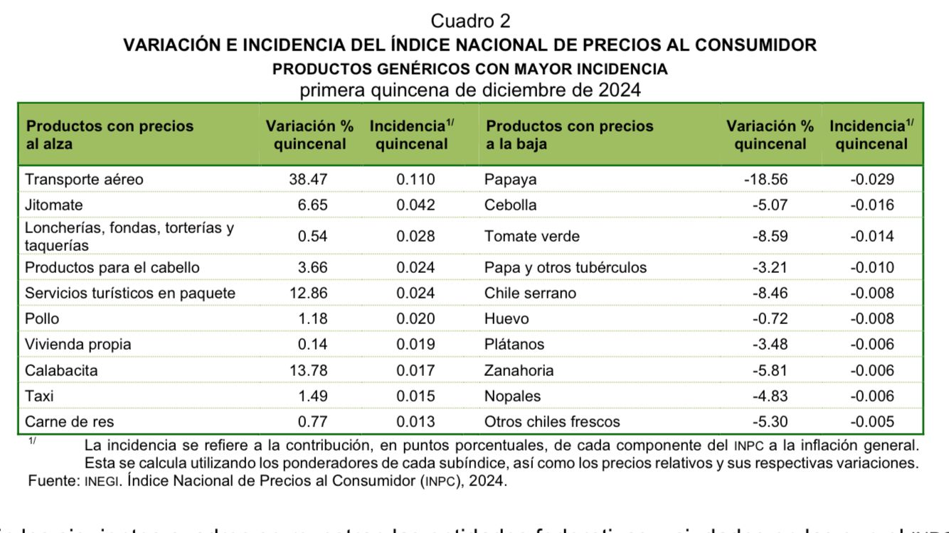 En la primera quincena de diciembre de 2024, el INPC aumentó 0.42 % respecto a la quincena anterior. Con este resultado, la inflación general anual se ubicó en 4.44 por ciento. En la misma quincena de 2023, la inflación quincenal fue de 0.52 % y la anual, de 4.46 por ciento.