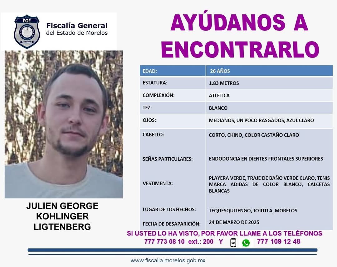 Se trata de Julien Kohlinger Ligtemberg, de origen Alemán, joven de 26 años, reportado como desaparecido desde el domingo pasado en Tequesquitengo, se supo que las características coinciden.