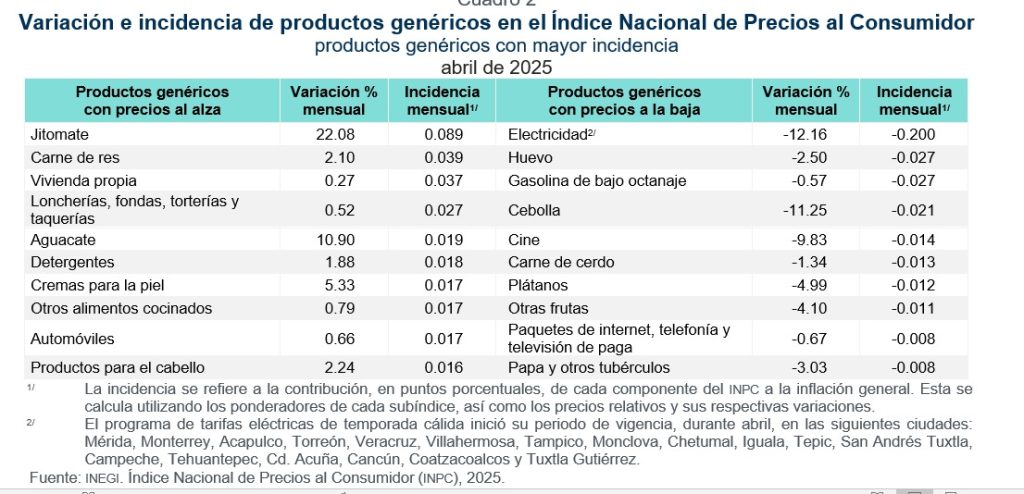 Dentro de este, los precios de los productos agropecuarios crecieron 1.60 % y los de energéticos y tarifas autorizadas por el gobierno cayeron 1.59 por ciento. Esto como resultado, en mayor medida, a los ajustes en las tarifas eléctricas por temporada cálida en 18 ciudades del país