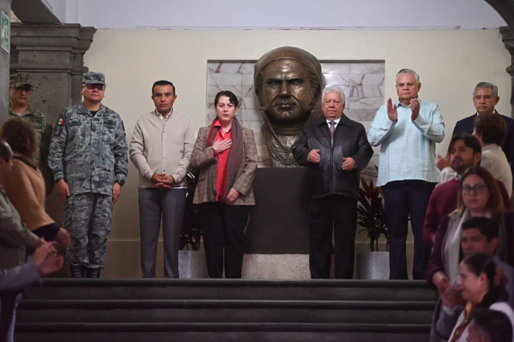 Posteriormente, Margarita González Saravia, junto con integrantes de su gabinete legal y ampliado, autoridades, federales, estatales y municipales, realizó el corte simbólico de listón en la nueva ubicación del busto del el “Siervo de la Nación”, en la parte superior de la escalinata del Palacio de Gobierno.