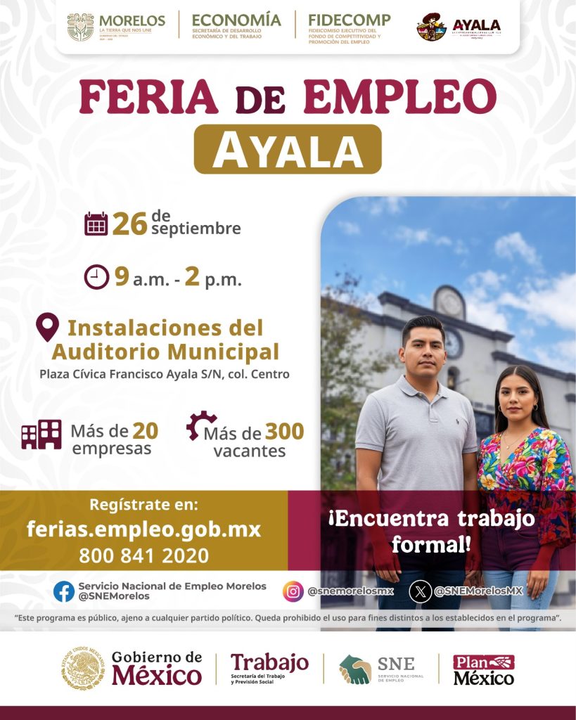El Gobierno de Morelos, “La tierra que nos une”, encabezado por Margarita González Saravia, anunció que la Feria de Empleo Ayala 2025 se realizará el viernes 26 de septiembre en el Auditorio Municipal. Con esta acción, se impulsan espacios de inclusión laboral que fortalecen la economía y el bienestar de la población.