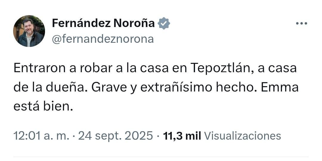 Tepoztlán.— La madrugada de este miércoles 24 de septiembre, el senador Gerardo Fernández Noroña denunció que su vivienda ubicada en este municipio fue víctima de un robo, hecho que calificó como “grave y extrañísimo”.