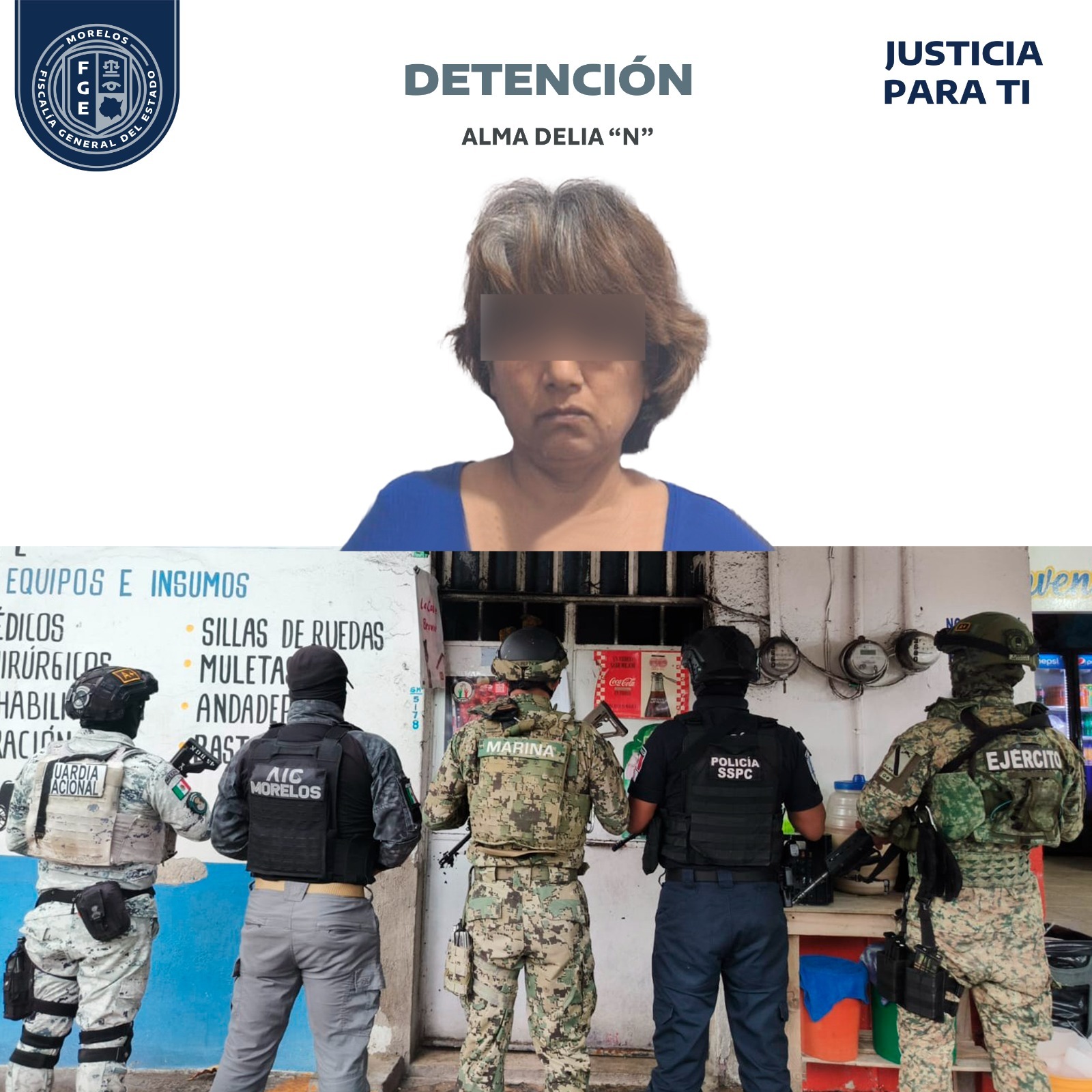 Durante el operativo se detuvo a Alma Delia “N”, quien quedó a disposición del agente del Ministerio Público (MP) especializado por el delito antes mencionado.
