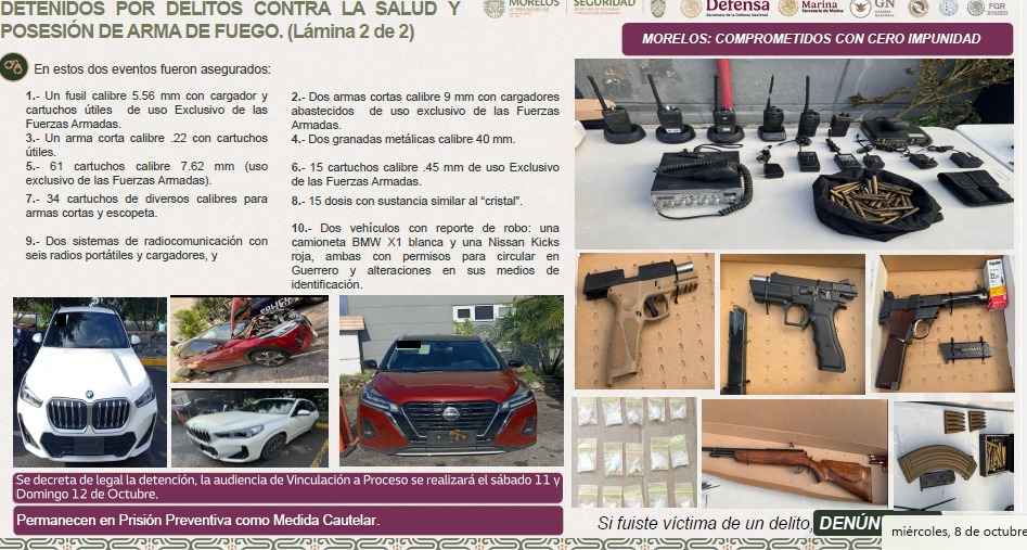 Los detenidos y los objetos asegurados fueron puestos a disposición de la autoridad correspondiente para las investigaciones respectivas. La SSPC de Morelos reitera su compromiso con la cero impunidad y exhorta a la ciudadanía a denunciar cualquier delito al 911 o a las instancias pertinentes.