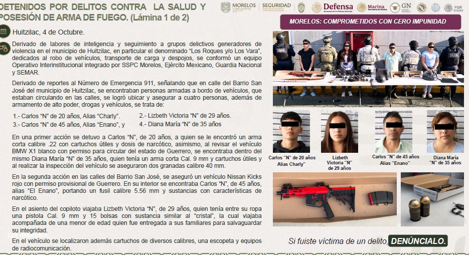Huitzilac, Morelos, 4 de octubre de 2025. – Como resultado de labores de inteligencia y seguimiento a grupos delictivos generadores de violencia en el municipio de Huitzilac, particularmente el denominado «Los Roques y/o Los Vara», dedicado al robo de vehículos, transporte de carga y despojos, se conformó un equipo Operativo Interinstitucional integrado por la Secretaría de Seguridad Pública y Ciudadana (SSPC) de Morelos, el Ejército Mexicano, la Guardia Nacional y la Secretaría de Marina (SEMAR).Derivado de reportes recibidos al Número de Emergencia 911, que alertaban sobre personas armadas a bordo de vehículos circulando en las calles del Barrio San José, en Huitzilac, se logró ubicar y asegurar a cuatro individuos, además de armamento de alto poder, drogas y vehículos con reporte de robo.