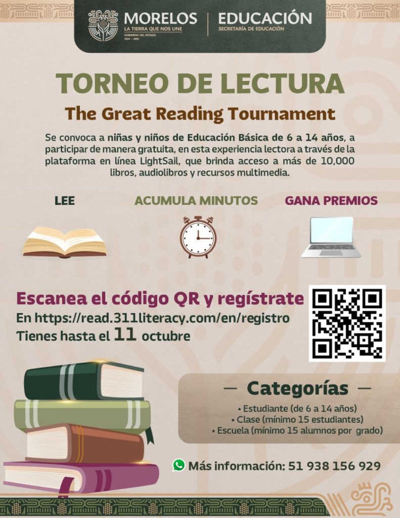 La Secretaría de Educación en coordinación con el Instituto de la Educación Básica del Estado de Morelos (IEBEM), convoca a niñas y niños de entre 06 y 14 años de edad a participar en el Torneo de Lectura 2025 “The Great Reading Tournament”, una iniciativa gratuita que busca impulsar el gusto por los libros y la comprensión lectora a través de la plataforma digital LightSail.