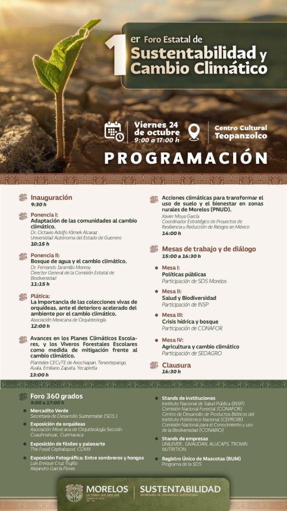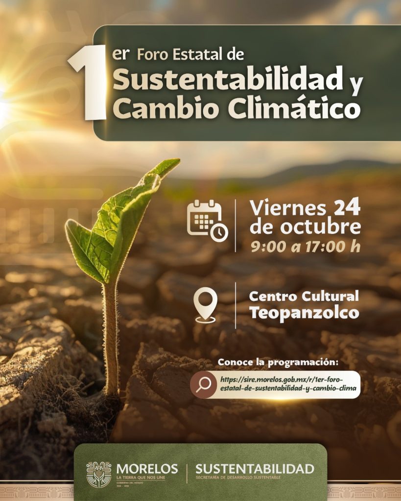 Con el objetivo de fortalecer el diálogo, la acción y la corresponsabilidad frente a los retos ambientales, la Secretaría de Desarrollo Sustentable (SDS) llevará a cabo el Primer Foro Estatal de Sustentabilidad y Cambio Climático, este viernes 24 de octubre, en el Centro Cultural Teopanzolco (CCT), de 09:00 a 17:00 horas.