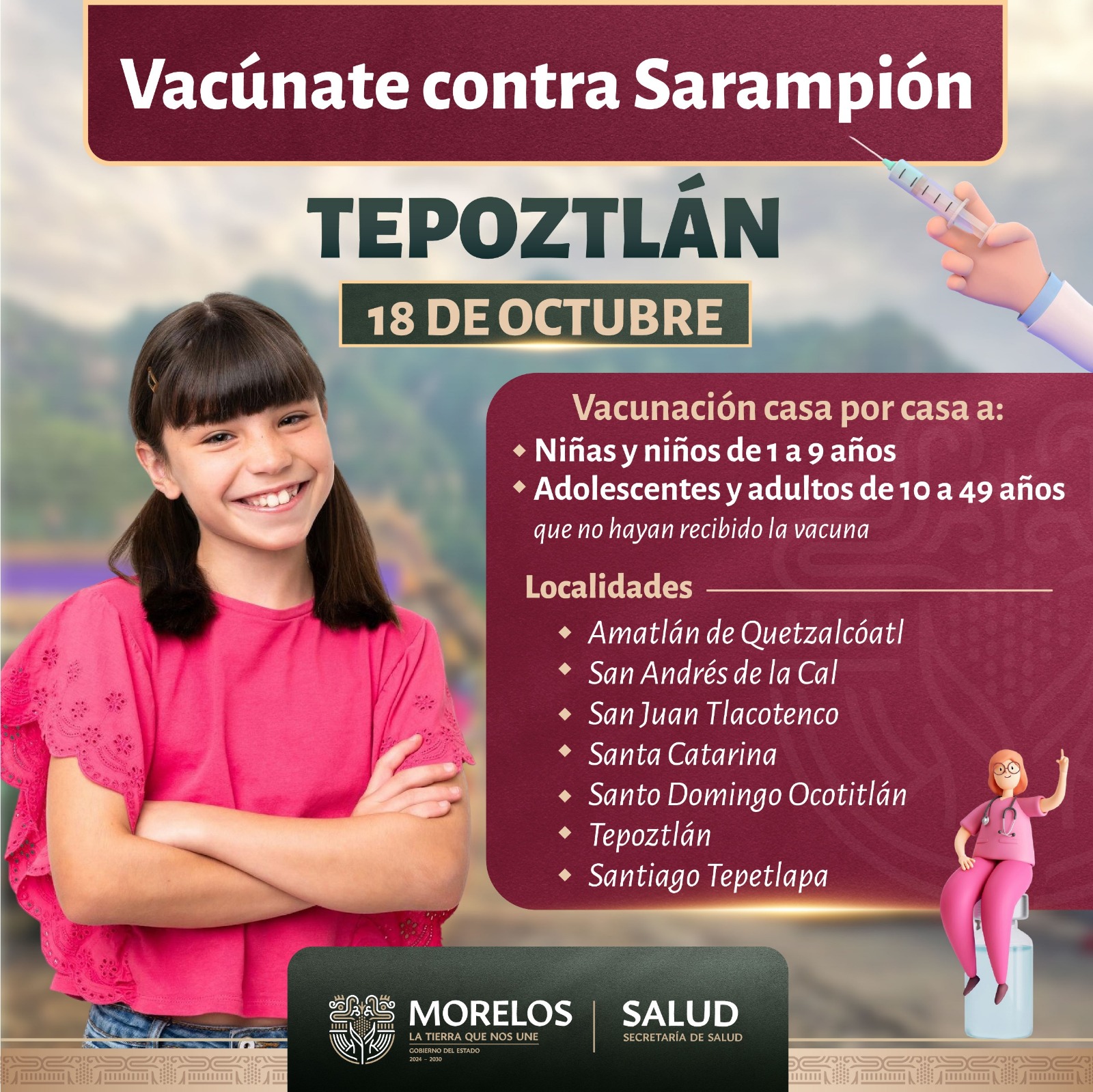 La Secretaría de Salud, a través de Servicios de Salud de Morelos (SSM), IMSS bienestar, IMSS Ordinario, ISSSTE y Servicio Nacional de Salud Pública, convoca a la población de Tepoztlán a participar en la jornada de vacunación casa por casa contra el sarampión y otras vacunas del esquema básico de salud, a realizarse el próximo 18 de octubre, con el objetivo de fortalecer la protección de niñas, niños y personas adultas frente a enfermedades prevenibles.