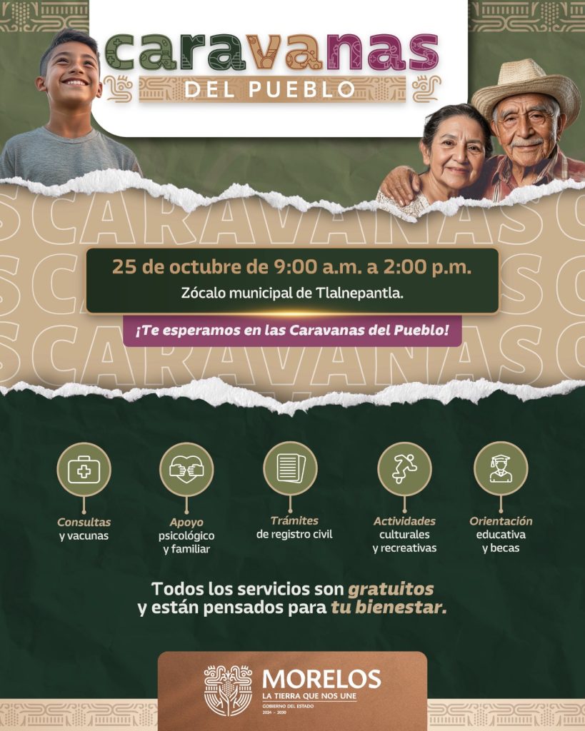 El Gobierno del Estado de Morelos, que encabeza la gobernadora Margarita González Saravia, invita a las familias del municipio de Tlalnepantla y comunidades aledañas a acudir, participar y aprovechar los servicios gratuitos que el programa Caravanas del Pueblo “Territorios de Paz y Buen Vivir” ofrecerá el próximo sábado 25 de octubre en la explanada del zócalo municipal.