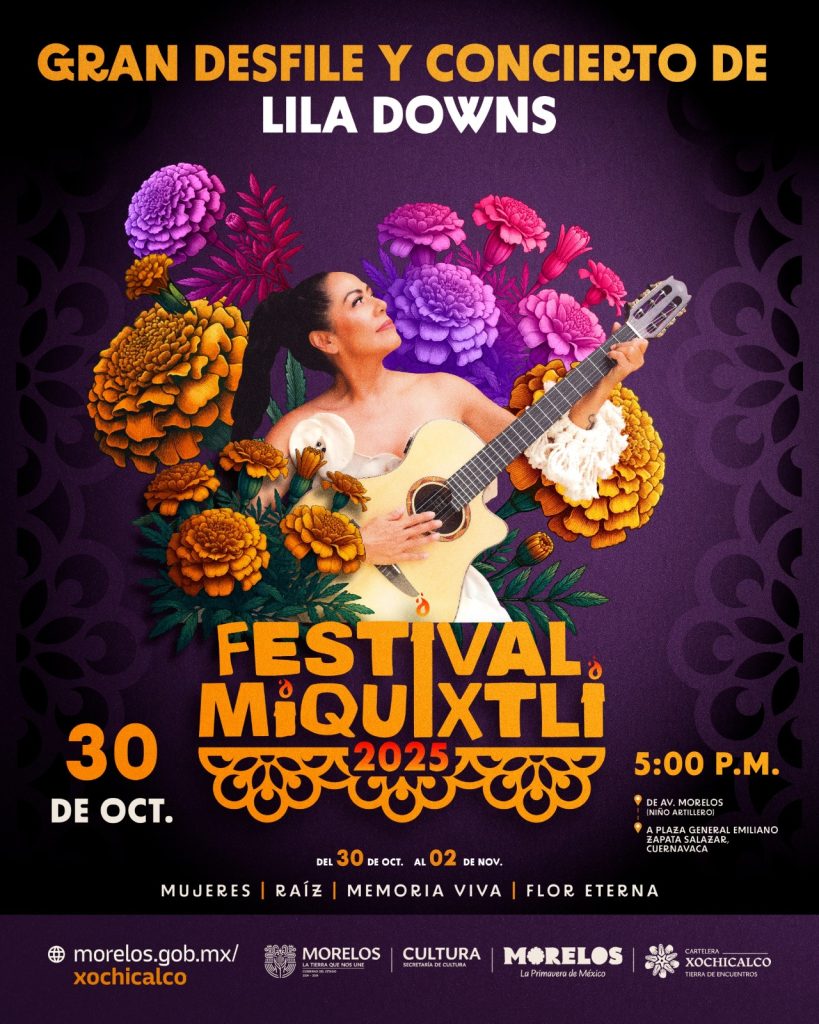 El Festival Miquixtli 2025 se realizará del 30 de octubre al 02 de noviembre, con actividades en Cuernavaca, Tlaltizapán, Axochiapan y la demarcación indígena de Coatetelco. Se espera la asistencia de más de 150 mil personas, con una amplia cartelera artística que incluye a Lila Downs, Las Hermanas García, La Voz de la Catrina (Sol Peña), Ensamble de Sonidos de la Matlalcueyetl y Caña Dulce Caña Brava, entre otros.