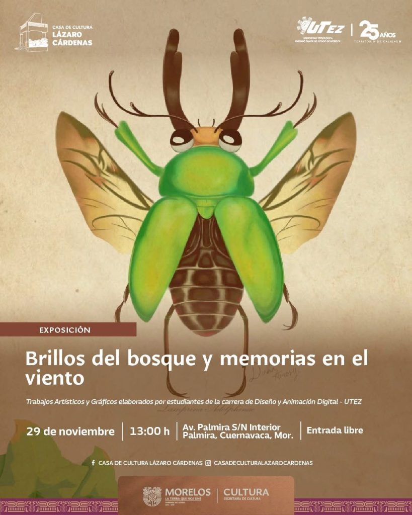 El Poder Ejecutivo, a través de la Secretaría de Cultura, informó que el sábado 29 de noviembre se llevará a cabo, la exposición “Brillos del bosque en el viento” por los estudiantes de la carrera de diseño y animación digital de la Universidad Tecnológica Emiliano Zapata (UTEZ), en el marco de los sábados culturales y mercadito verde, el encuentro busca fortalecer la formación creativa y acercar su trabajo a la comunidad, en la Casa de Cultura Lázaro Cárdenas.