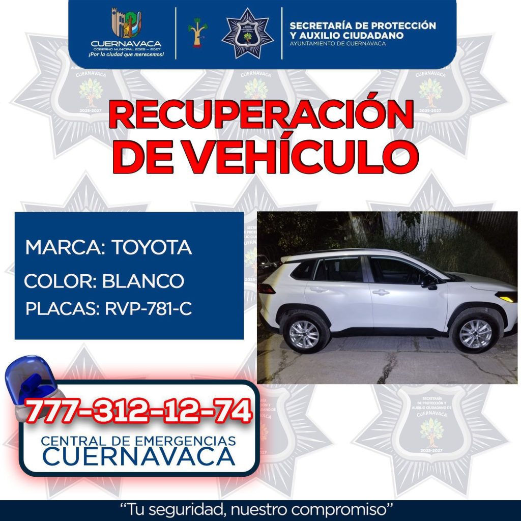 Gracias a la pronta respuesta de elementos de la Secretaría de Protección y Auxilio Ciudadano (SEPRAC), y al reporte ciudadano recibido a través del Centro de Comando, Control, Comunicación y Cómputo (C4), se logró la recuperación de una camioneta marca Toyota, tipo Corolla Cross, modelo 2025, con placas de circulación RVP781C, que fue robada con lujo de violencia en la colonia Jardines de Cuernavaca.