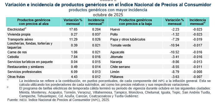 El índice de precios subyacente, que excluye bienes y servicios con precios más volátiles, o que no responden a condiciones de mercado, incrementó 0.29 % a tasa mensual. A su interior, los precios de las mercancías subieron 0.17 % y los de servicios, 0.39 por ciento. A tasa mensual, el índice de precios no subyacente creció 0.63 por ciento. Dentro de este, los precios de los productos agropecuarios bajaron 0.90 % y los de energéticos y tarifas autorizadas por el gobierno ascendieron 1.89 por ciento. Lo anterior, en mayor medida, por la conclusión del subsidio al programa de tarifas eléctricas de temporada de verano en 18 ciudades del país donde el inpc tiene cobertura