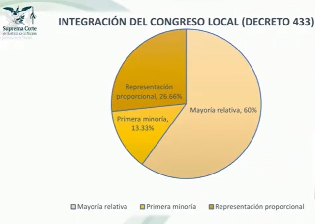 En el Decreto 433 del Congreso de Morelos, que pretendía aumentar de 20 a 30 el número de diputados locales e introducir la figura de “diputaciones de primera minoría” la ministra sentenció que esta figura simplemente no existe en la constitución que contempla solo Mayoría Relativa y Representación proporcional.