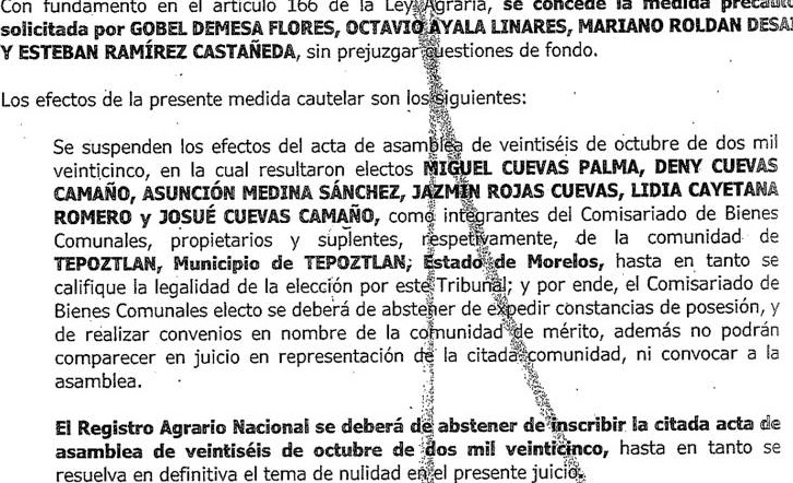 El Tribunal Unitario Agrario del Distrito 18 suspendió los efectos de la elección del Comisariado de Bienes Comunales del 26 de octubre, frenando por el momento el control histórico de la familia Cuevas, que por décadas ha rotado el poder en la comunidad. La medida responde a una admisión de la demanda de nulidad (expediente 525/2025) interpuesta por Gobel Demesa Flores, Octavio Ayala Linares, Mariano Roldán Desaida y Esteban Ramírez Castañeda contra los titulares y suplentes que se dijeron ganadores de esa elección Miguel Cuevas Palma, Deny Cuevas Camaño, Jazmín Rojas Cuevas, Josué Cuevas Camaño, Asunción Medina Sánchez y Lidia Cayetana Romero.