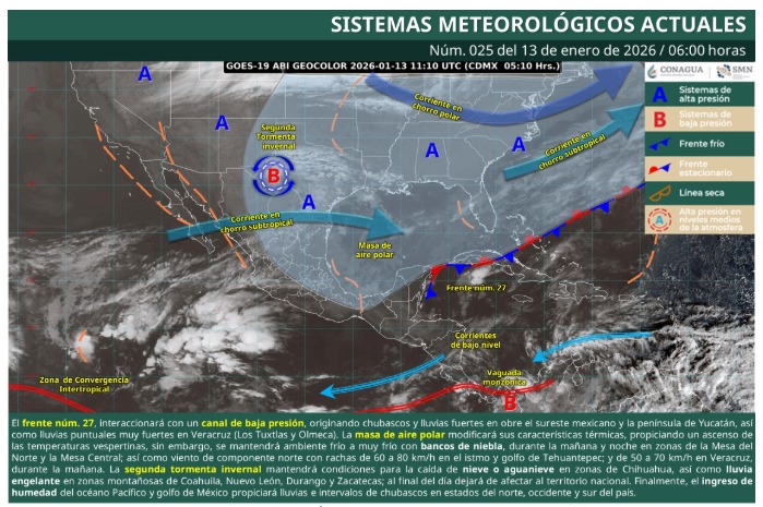 La segunda tormenta de la temporada mantendrá condiciones propicias para la caída de nieve o aguanieve en Chihuahua, además de lluvia engelante en las zonas serranas de Coahuila, Nuevo León, Durango y Zacatecas. De manera paralela, se registrará viento de componente norte con rachas de 60 a 80 km/h en el Istmo y Golfo de Tehuantepec, y de 50 a 70 km/h en las costas de Veracruz.