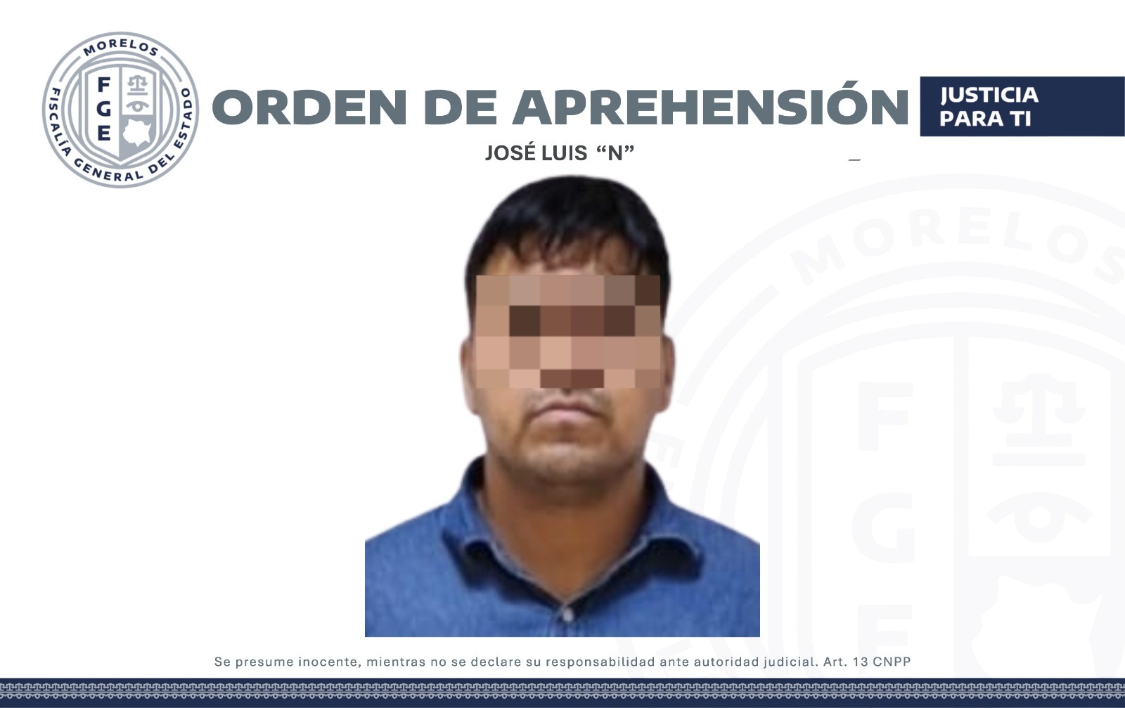 Las personas son citadas en este comunicado de acuerdo a lo marcado por el artículo 13 del Código Nacional de Procedimientos Penales, que dice: “Toda persona se presume inocente y será tratada como tal en todas las etapas del procedimiento, mientras no se declare su responsabilidad mediante sentencia emitida por el Órgano jurisdiccional”.