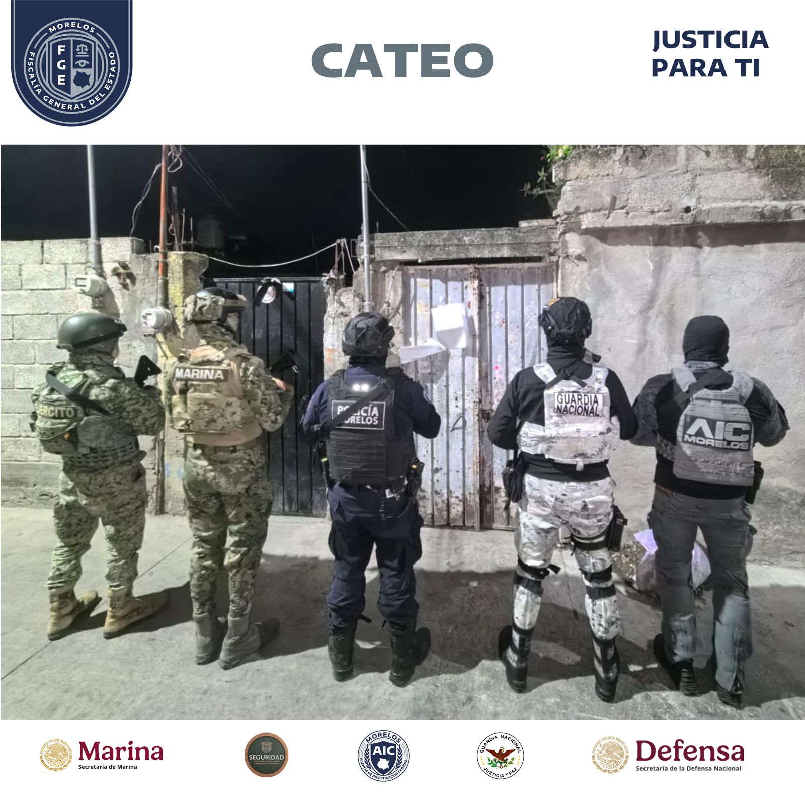 La diligencia fue encabezada por personal de la AIC y contó con el apoyo de elementos de la Secretaría de Marina, Defensa Nacional (Defensa), Guardia Nacional (GN) y Secretaría de Seguridad y Protección Ciudadana (SSPC) Morelos, quienes intervinieron una casa en la colonia Centro.