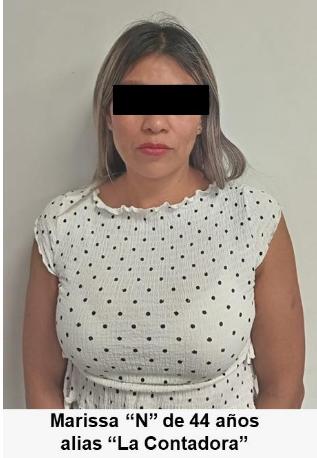 Junto con Edgar “N”, de 38 años, alias “El Conta o El Gordo”, también fue asegurada Marissa “N”, alias “La Contadora”, de 44 años, quien fungía como encargada financiera de Milton Jair “N”, alias “El Tepis y/o El General”, enlace con diversos funcionarios de primer nivel de la zona de los Altos de Morelos para negociar obra pública y la adquisición de productos y servicios.