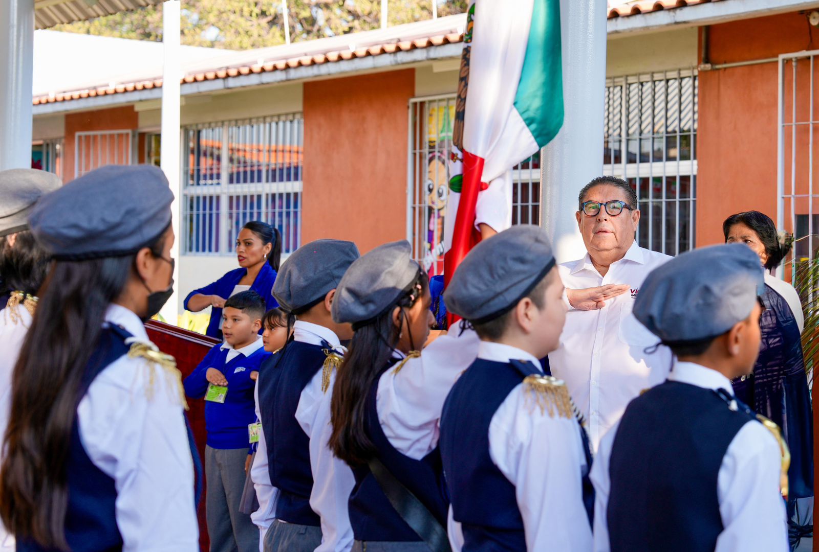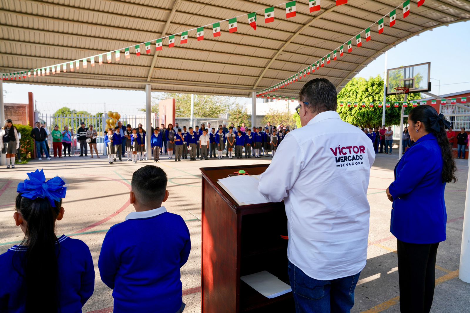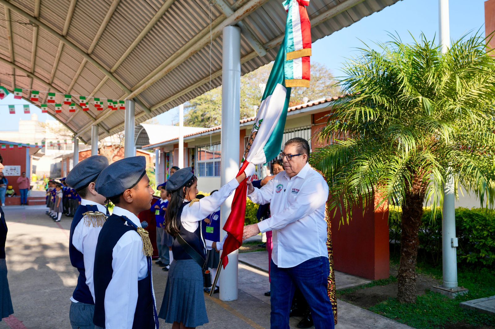El senador de Morena por Morelos, Víctor Mercado Salgado, agradeció la invitación de la directora Anayeli Becerra Pliego para participar en la ceremonia de honores a la Bandera en la Escuela Primaria “17 de Abril de 1869”, ubicada en la colonia Nueva Santa María de Cuernavaca.