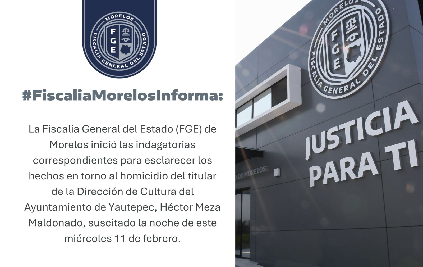 La Fiscalía General del Estado (FGE) de Morelos inició las indagatorias correspondientes para esclarecer los hechos en torno al homicidio del titular de la Dirección de Cultura del Ayuntamiento de Yautepec, Héctor Meza Maldonado, suscitado la noche de este miércoles 11 de febrero.