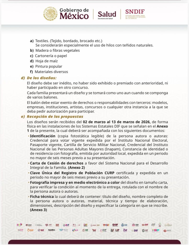Este concurso tiene como finalidad impulsar la creatividad, la identidad cultural y convivencias entre las familias, mediante la elaboración de un diseño original plasmado en un balón de fútbol que tenga una circunferencia de 68 a 70 centímetros y un peso de 410 a 450 gramos, para el diseño se podrán utilizar materiales como textiles, madera o fibras vegetales, cartonería o papel, hoja de maíz, pintura popular y otros materiales.