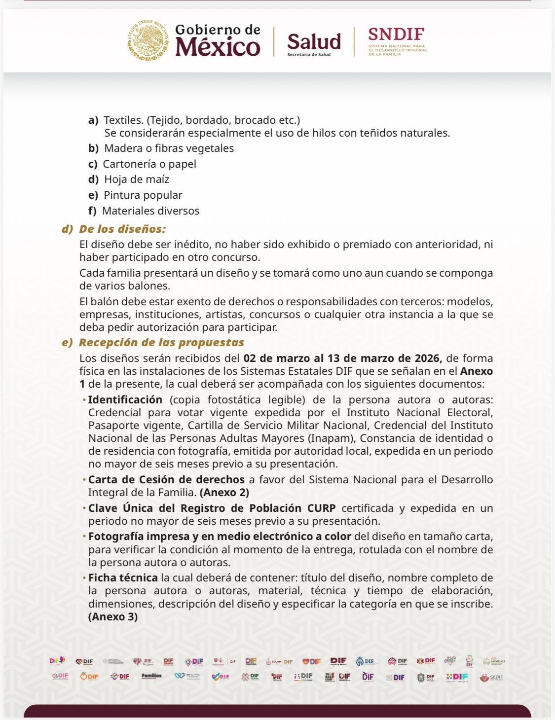 El director general del SEDIF, Jorge Erik Alquicira Cedillo, explicó que las propuestas deberán entregarse de manera física del 02 al 13 de marzo de 2026 en las instalaciones del SEDIF, ubicadas en calle Las Quintas número 15, colonia Cantarranas en Cuernavaca, y cumplir con los documentos establecidos en la convocatoria del Sistema Nacional DIF (SNDIF).