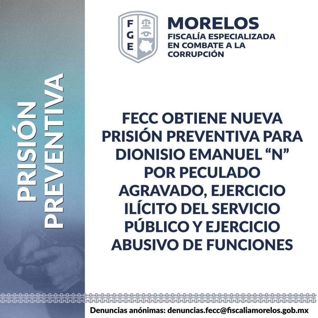 La Fiscalía Especializada en Combate a la Corrupción (FECC), a través del agente del Ministerio Público (MP) especializado llevó ante un juez de control a Dionisio Emanuel “N”, a quien le formuló imputación por peculado agravado, ejercicio ilícito del servicio público y ejercicio abusivo de funciones, delitos que habría cometido en perjuicio del Fideicomiso del Lago de Tequesquitengo (Filateq).