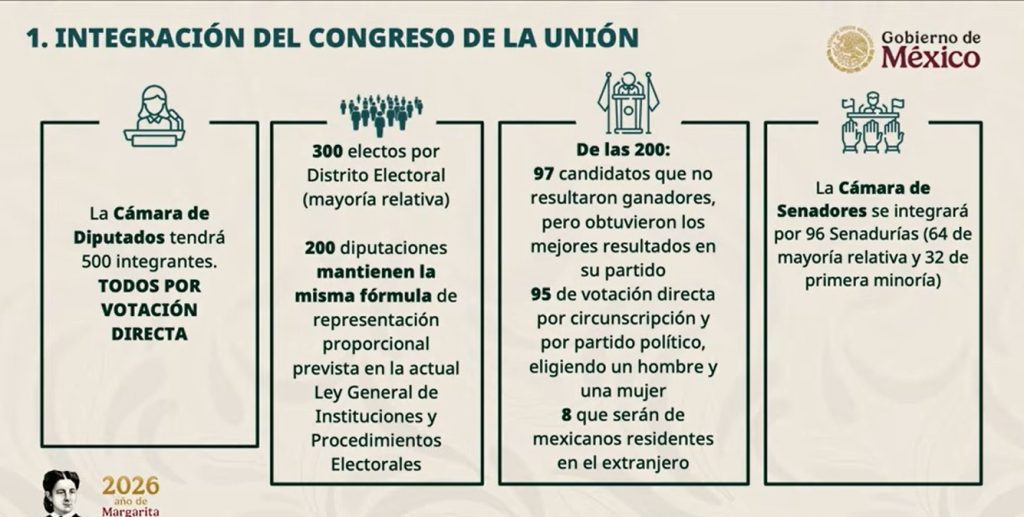 Cámara de Diputados: 500 integrantes, todos por voto directo (300 por mayoría relativa en distritos, 200 por representación proporcional con fórmula actual, incluyendo 95 por circunscripción y partido con paridad de género, más 8 para migrantes).