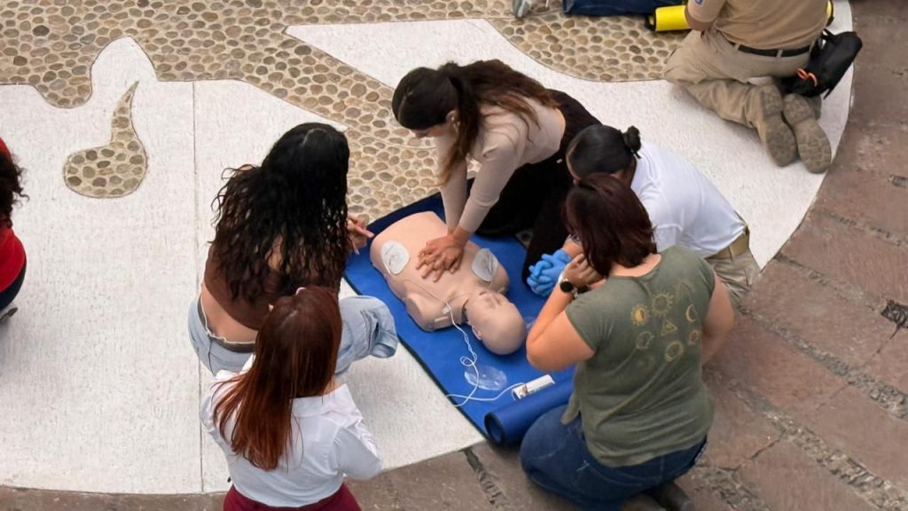 Como parte de la programación, se llevó a cabo una capacitación teórico-práctica, en la que las y los asistentes aprendieron maniobras de reanimación cardiopulmonar (RCP) y el uso adecuado del Desfibrilador Externo Automático (DEA), herramientas importantes para restablecer el ritmo cardíaco en situaciones de paro súbito.