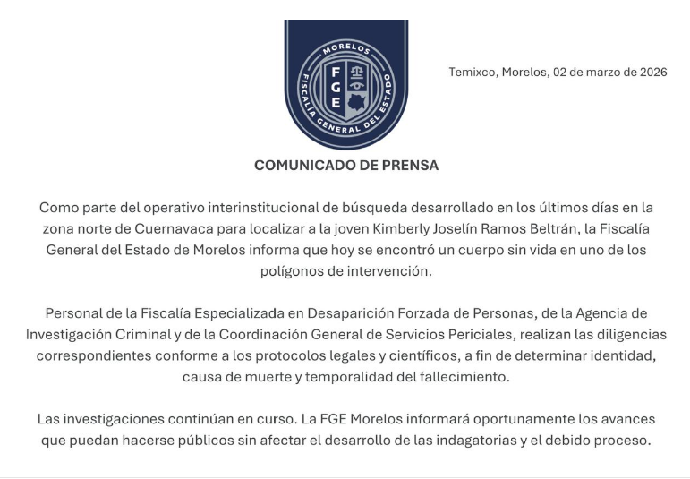 Como parte del operativo interinstitucional de búsqueda desarrollado en los últimos días en la zona norte de Cuernavaca para localizar a la joven Kimberly Joselín Ramos Beltrán, la Fiscalía General del Estado de Morelos informa que hoy se encontró un cuerpo sin vida en uno de los polígonos de intervención.