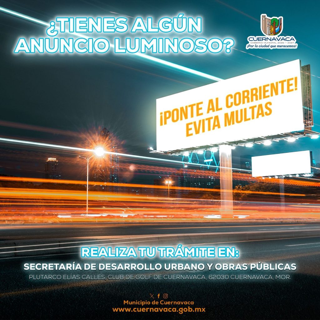 El Ayuntamiento de Cuernavaca exhorta a propietarios de anuncios publicitarios luminosos instalados en la ciudad a realizar la revalidación anual de sus licencias, un trámite obligatorio que permite mantener en regla estas estructuras y evitar sanciones administrativas por incumplimiento de la normatividad municipal.