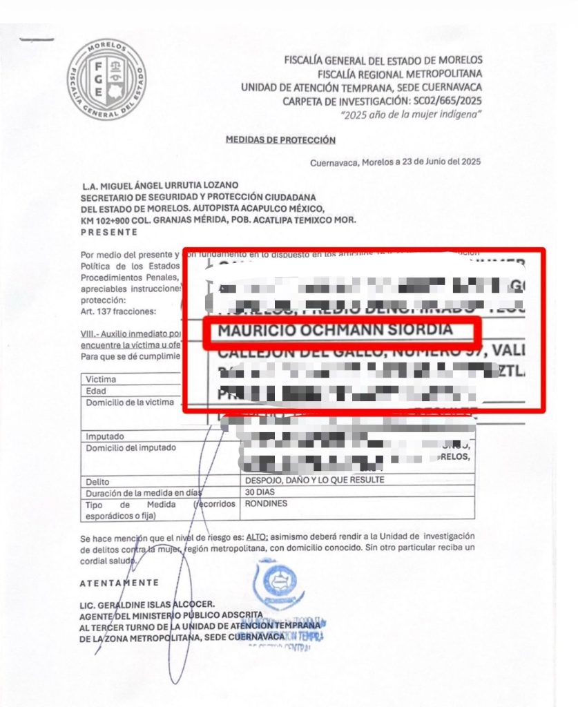 El actor Mauricio Ochmann fue denunciado ante la Fiscalía General del Estado de Morelos por una mujer de la tercera edad identificada como Ingrid Margarita, por presuntos hechos relacionados con un inmueble ubicado en Amatlán de Quetzalcóatl, dentro del municipio de Tepoztlán.
