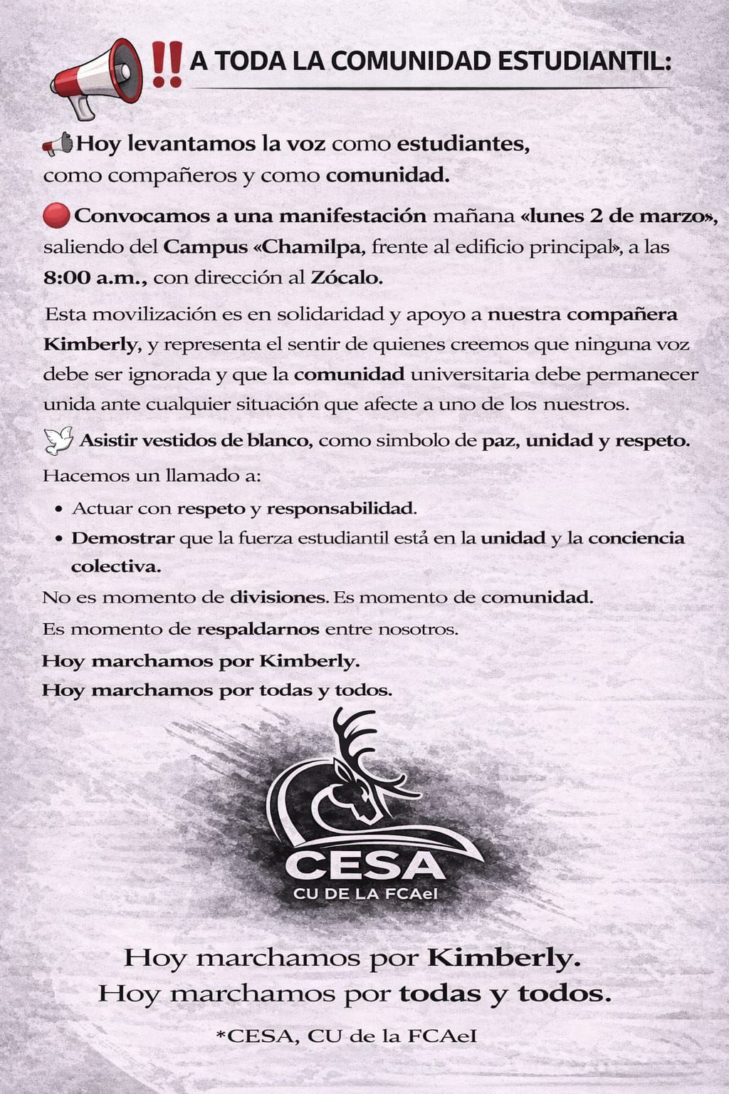 Este lunes dos de marzo, estudiante de la facultad de contaduría de la universidad autónoma del estado de Morelos, convocan a una marcha que partirá de la máxima casa de estudios a la plaza general Emiliano Zapata Salazar, exigiendo la presentación con vida de su compañera Kimberly y que será una muestra de que la comunidad universitaria esta mas unida.