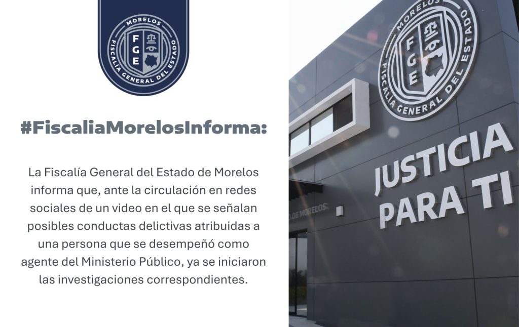 La Fiscalía General del Estado de Morelos informa que, ante la circulación en redes sociales de un video en el que se señalan posibles conductas delictivas atribuidas a una persona que se desempeñó como agente del Ministerio Público, ya se iniciaron las investigaciones correspondientes.