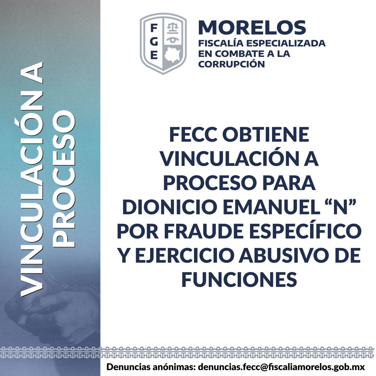 La Fiscalía Especializada en Combate a la Corrupción (FECC) obtuvo un auto de vinculación a proceso en contra de Dionicio Emanuel “N”, por su probable participación en los delitos de fraude específico y ejercicio abusivo de funciones, en perjuicio de una víctima y de la sociedad.