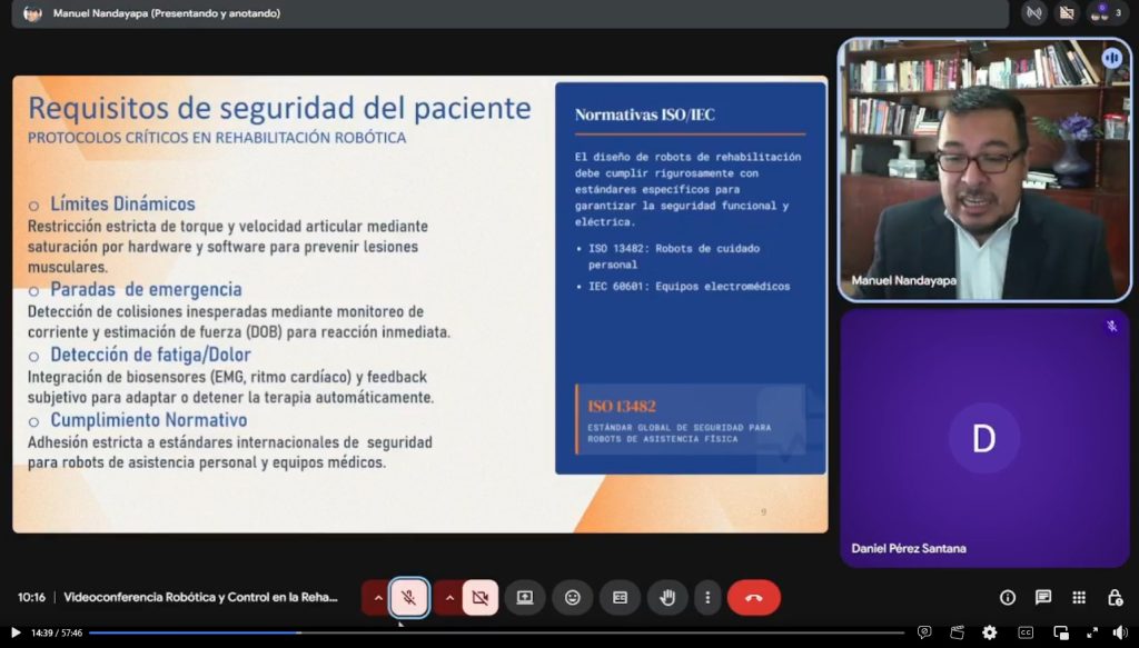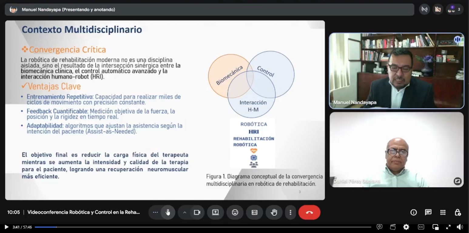 La sesión contó con la participación del doctor Manuel de Jesús Nandayapa Alfaro, profesor investigador del Instituto de Ingeniería y Tecnología de la Universidad Autónoma de Ciudad Juárez, quien compartió experiencias y avances en el uso de sistemas robóticos y de control aplicados a procesos de rehabilitación física.